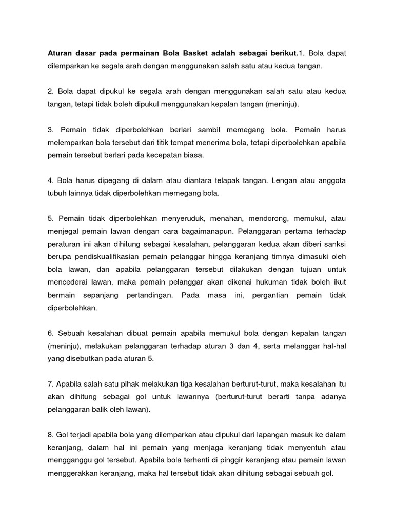 Inilah peraturan permainan bola basket yang dipakai dalam sebuah pertandingan. Seperti dijelaskan sebelumnya, ada banyak aspek yang perlu diatur untuk menjamin pertandingan bola basket sesuai dengan yang diharapkan dan terlaksana adil dan jujur. Peraturan permainan bola basket dalam permainan atau olah raga apapun yang akan menjadikan tontonan menjadi menarik adalah adanya peraturan. Selain membantu wasit utama, wasit pembantu dalam pertandingan basket juga dapat menentukan keputusan mengenai sah atau tidaknya suatu gol atau poin yang. Pelanggaran (foul) dalam bermain bola basket. Namun sebuah pelanggaran dimana pemain mendribble bola dengan gerakan lebih dari tiga langkah. Jika bola dijatuhkan dari ketinggian 1,8 meter maka bola harus dapat kembali pada ketinggian: Dalam permainan bola basket, anda bisa memindahkan bola basket dengan cara mengoper kepada teman anda atau dengan teknik dribbling. Pertandingan tersebut akan berhasil membawa sebuah permainan bola basket terkenal ke seluruh amerika serikat. Pada pon i di surakarta bola basket telah masuk dalam acara pertandingan. Sarana dan prasarana permainan bola basket. Peraturan dalam basket bisa meliputi banyak hal, mulai dari jumlah pemain, durasi waktu pertandingan, hingga durasi permainan bola basket menurut federasi bola basket internasional (fiba) adalah 4×10 menit, sedangkan aturan national basketball association (nba) adalah 4×12 menit. Uniknya, pada saat pertama kali pada kemunculannya, jumlah tim secara.