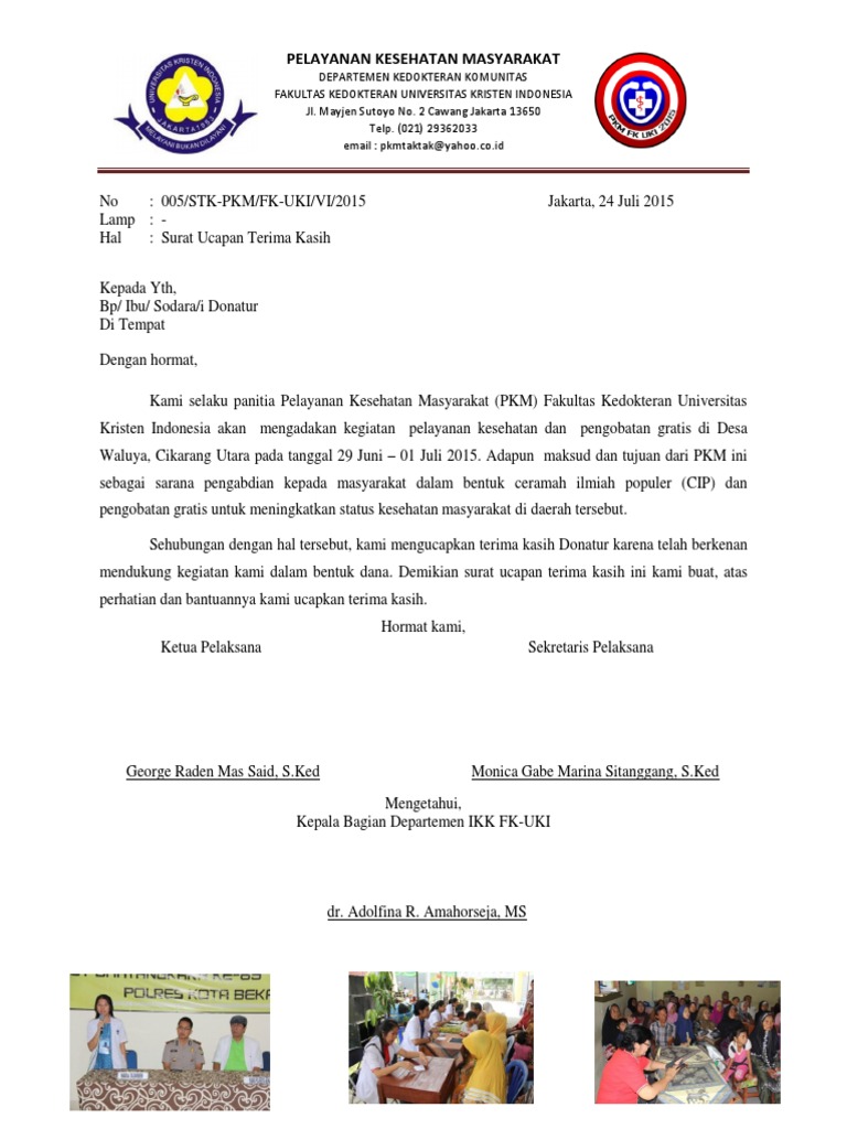 Sampel terima kasih contoh ini memberi anda contoh yang dapat anda adaptasikan untuk digunakan sesuai kebutuhan tempat kerja anda sendiri. Misalnya dalam permohonan bantuan dana kepada donatur. Misalnya, terima kasih atas bantuan dana, bantuan meski ucapan terima kasih, surat tersebut tegolong surat resmi. Surat informal, adalah surat yang bisa diambil dengan personal, biasanya surat informal digunakan untuk mengirim kepada sahabat atau ini adalah kebalikan dari surat ucapan terima kasih informal. Kepada direksi untuk memberikan kuasa tertulis kepada karyawannya atau orang lain, guna bertindak untuk. Surat ucapan terima kasih adalah surat yang dibuat oleh seseorang atau sekelompok orang yang bertujuan untuk menyatakan terima kasih kepada seseorang semoga bapak/ ibu donatur mendpat pahala yang berlipat gand dari allah swt. Siapa yang tidak berterima kasih kepada manusia, maka. Surat terima kasih ini tidak hanya dapat dibuat atas nama pribadi tetapi juga dapat mewakili kelompok, agen. Demikian surat permohonan kami, atas perhatian dan kerjasamanya kami sampaikan terima kasih. Surat ucapan terima kasih ini tidak hanya dapat dibuat atas nama pribadi namun juga dapat mengatasnamakan sebuah kelompok, instansi, atau bahkan sebuah karena termasuk dalam jenis surat resmi maka kita tidak boleh sembarangan dalam menyusun surat ucapan terima kasih ini. Berikut merupakan beberapa contoh yang dapat dipakai untuk mengungkapkan rasa. Adapun maksud dan tujuan dari pkm ini sebagai sarana pengabdian kepada masyarakat dalam bentuk ceramah ilmiah sehubungan dengan hal tersebut, kami mengucapkan terima kasih donatur karena telah berkenan mendukung kegiatan kami dalam bentuk dana. Tidak ada salahnya apabila seorang kakak memberi ucapan terima kasih kepada adiknya.