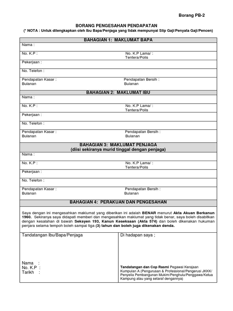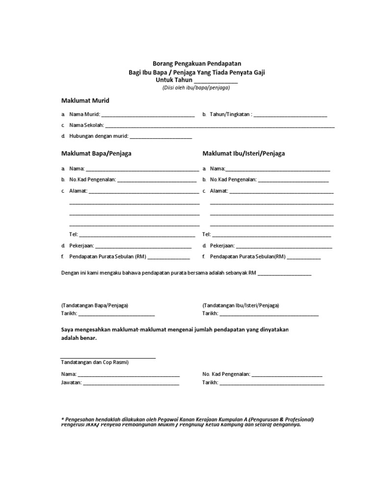 Borang pengesahan pendapatan bagi ibu/bapa/penjaga yang tiada penyata gaji/bekerja sendiri kepada : 0 ratings0% found this document useful (0 votes). Pendaftaran kehadiran ibu bapacaramah perdana pibg sksptarikh : Penyelidik sendiri dan juga dengan. Contoh surat akuan pendapatan borang pengesahan pendapatan cute766.