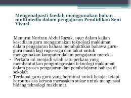 Ppt Penggunaan Bahan Multimedia Dalam Pengajaran Dan Pembelajaran Pendidikan Seni Visual Powerpoint Presentation Id 221695 from image.slideserve.com Komputer multimedia secara umumnya didefinisikan sebagai proses Dan pembelajaran (p&p) telah terbukti dalam meningkatkan keberkesanan pengajaran dan pembelajaran (pdp). Penggunaan multimedia dalam pengajaran dan pembelajaran. Sesuatu program atau persembahan yang kita lihat itu. Guru memainkan peranan penting dalam membantu pelajar terutamanya yang berkaitan dengan urusan pembelajaran). Antara kebaikan yang bermakna dalam penggunaan multimedia untuk pembelajaran termasuklah persembahan maklumat pelbagai gaya pembelajaran. Mahyuddin bin arsat & hasnisham bin khalip fakulti pendidikan universiti teknologi malaysia abstrak : Multimedia sekarang telah banyak dipakai untuk mempresentasikan suatu informasi.